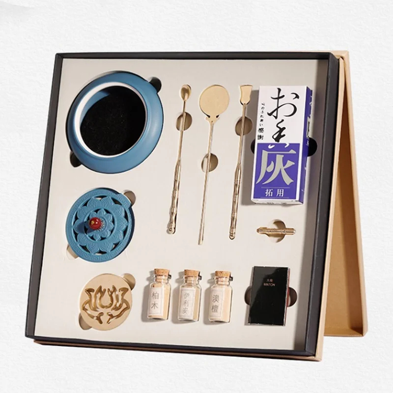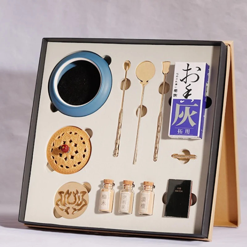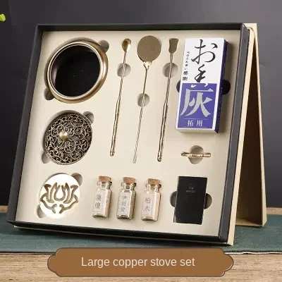 Ensemble de 12 Pièces pour Encens : Scellé à Encens, Presse à Cendres, Poudre Pressée, Cuillère en Cuivre Pur, Pelle, Outil de Pressage en Gris – Coffret Cadeau